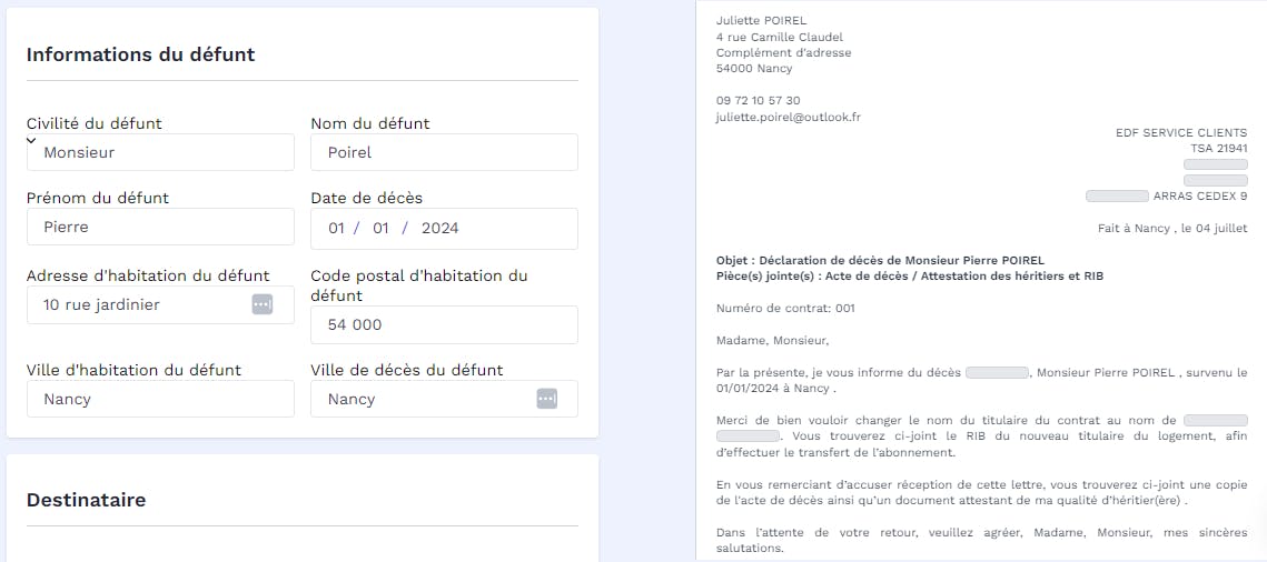 Nous avons conçu un service qui vous aide dans la réalisation des démarches nécessaires à la résiliation ou la modification de contrats d'eau et d'électricité après décès. Vous y trouverez un courrier prêt à remplir ainsi que les documents nécessaires. Vous pouvez également suivre facilement vos courriers. Cliquez sur l'image ci-dessous pour accéder à ce service gratuitement :