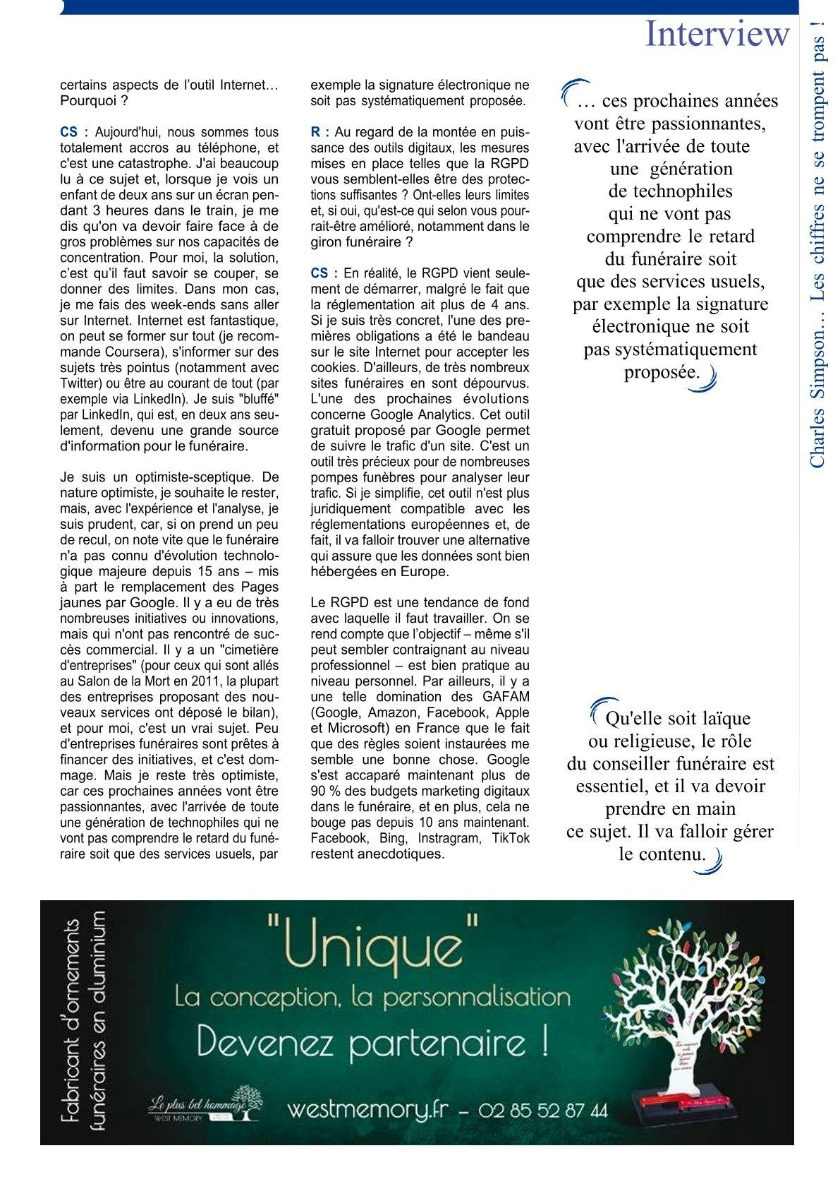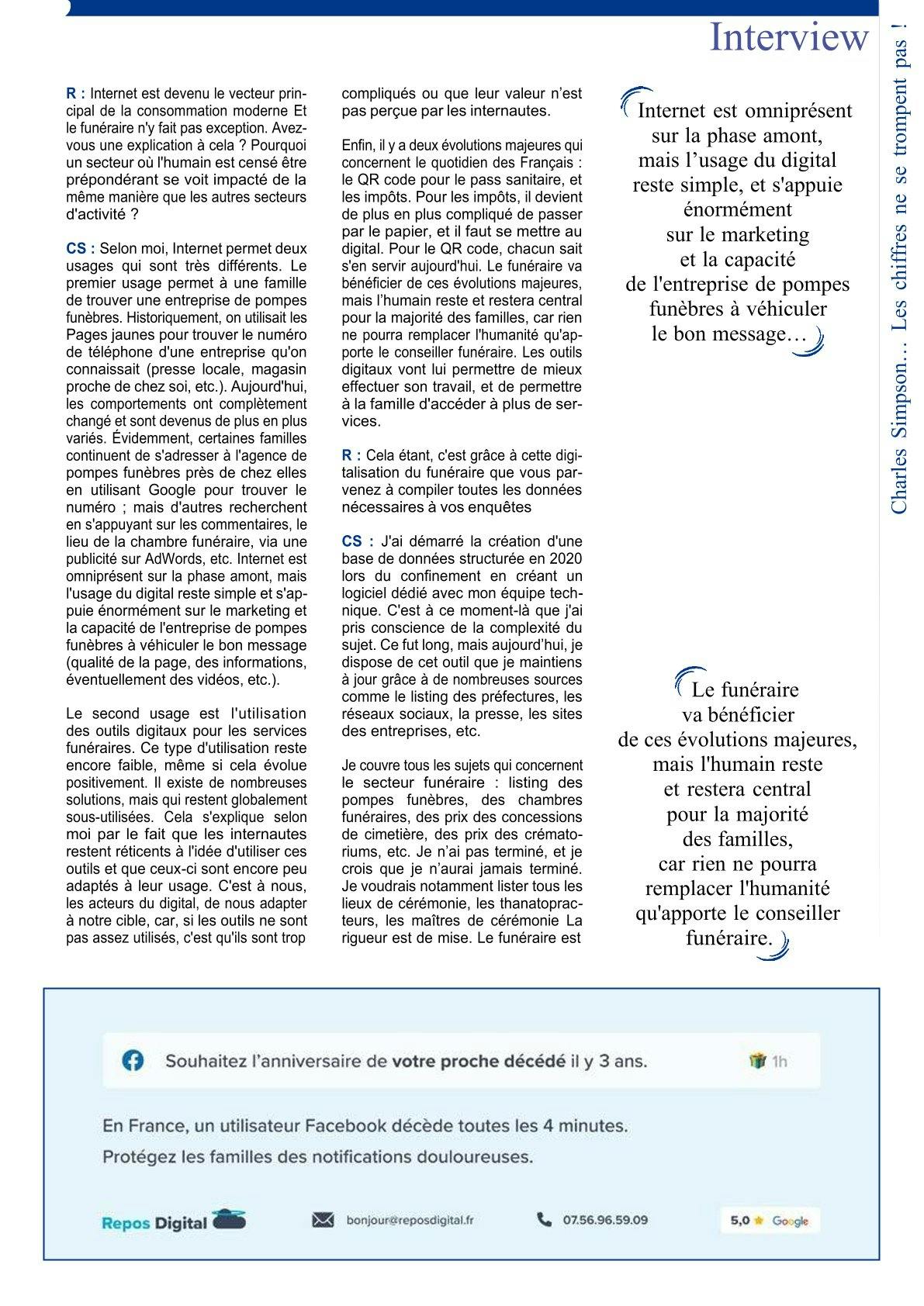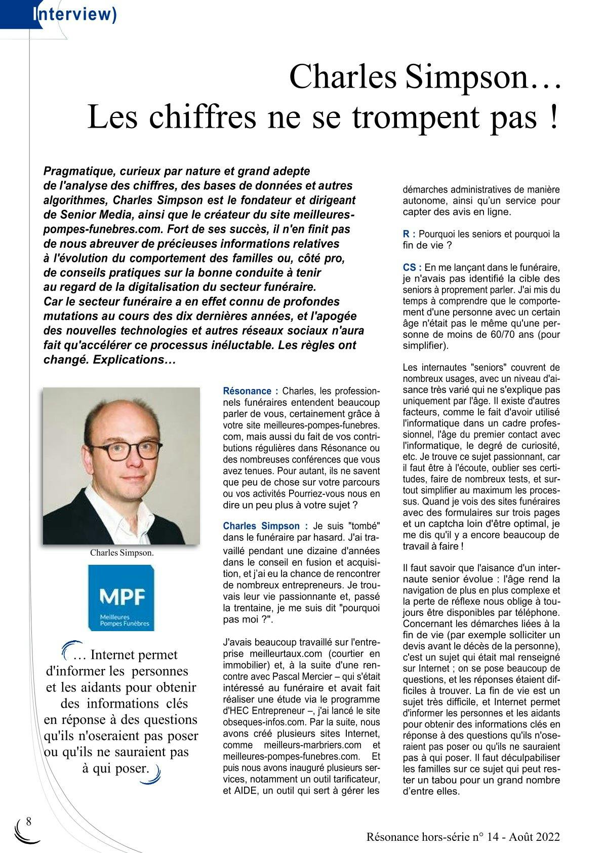 "Charles Simpson… Les chiffres ne se trompent pas !" Tel est le titre de l'interview exclusive accordée au magasine spécialisé Résonance funéraire. Découvrez-en plus ci-dessous !