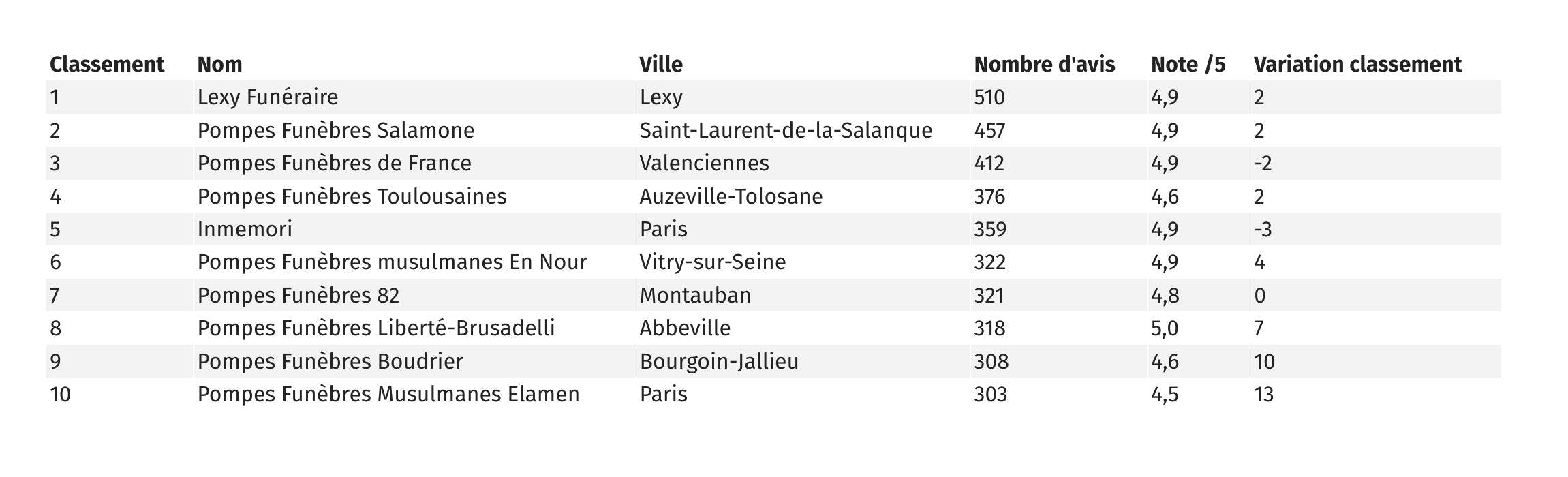 Nous avons pu mettre à jour nos bases de données en juillet 2024 et nous vous proposons alors une analyse complète sur les avis clients : les tendances, une mise à jour réglementaire et enfin un classement des agences de pompes funèbres selon les avis clients.