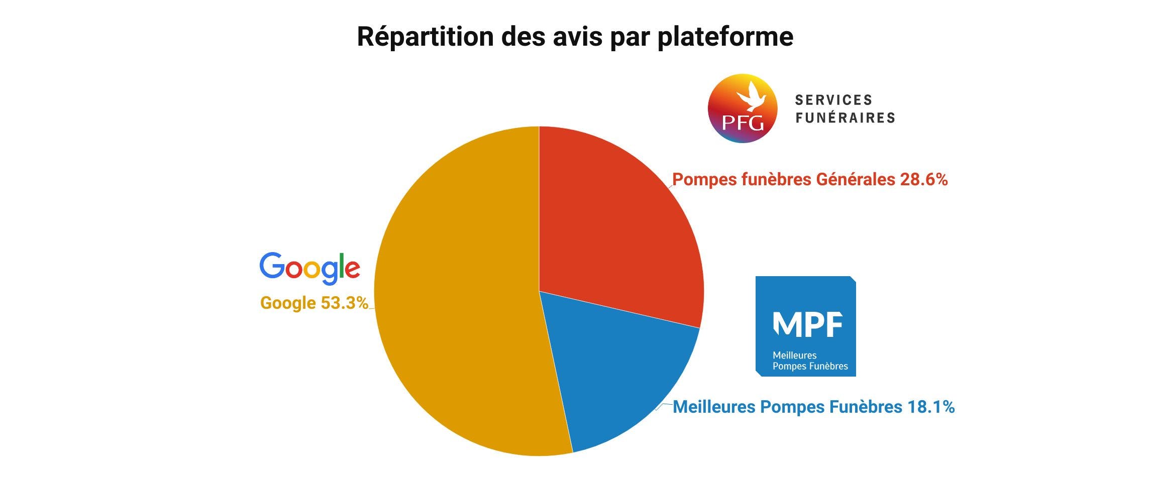 Google est la plateforme ayant recueilli le plus grand nombre d'avis avec 191 273 avis, suivie par Pompes Funèbres Générales avec 102 541 avis qui utilisent leur propre outil pour suivre leurs avis et ceux-ci sont repris par Google, et Meilleures Pompes Funèbres avec 65 071 avis (qui eux, sont certifiés : il faut avoir géré des obsèques ou transmis un devis pour pouvoir laisser un avis).