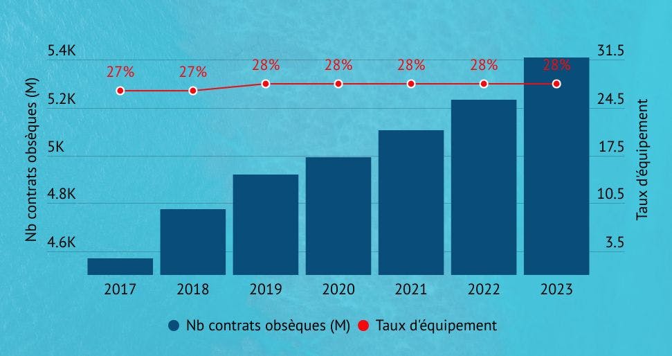 En 2023, il est estimé que 28,5 % de la population cible est équipée d'un contrat obsèques, sachant qu'elle représente 18,9 millions de personnes (source INSEE) de plus de 60 ans en France. Ce chiffre met en lumière l'importance croissante de la prévoyance funéraire parmi les seniors, qui cherchent à soulager leurs proches des préoccupations financières liées à leur décès.