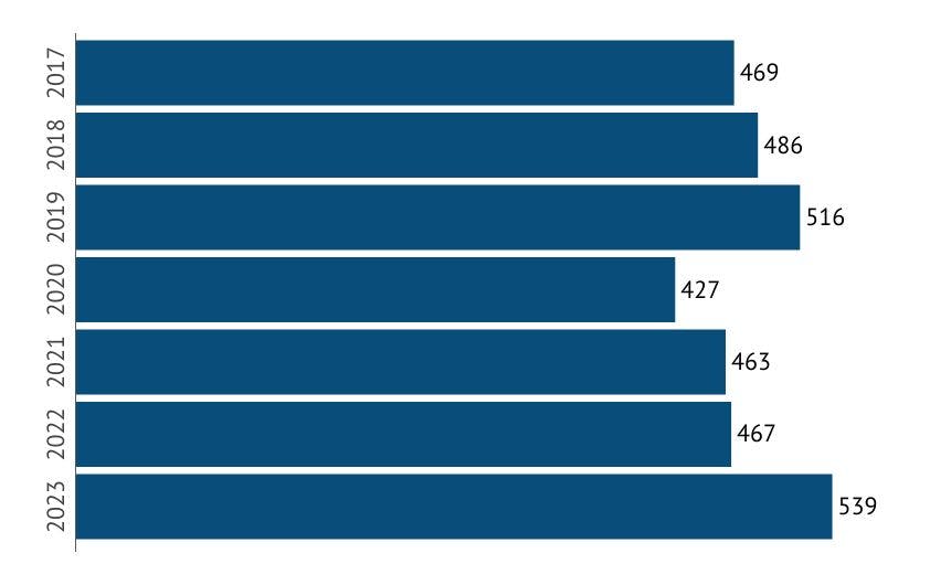 L'année 2023 se distingue par un total de 539 000 contrats d'assurance obsèques souscrits, marquant une forte progression (+15,4 %) par rapport à l'année précédente, qui comptabilisait 467 100 contrats. En effet, ce chiffre dépasse largement le niveau d'avant la pandémie, établi à 516 000 en 2019. Les années intermédiaires ont témoigné de fluctuations, avec une baisse notable en 2020 à 427 000, suivie d'une reprise en 2021 avec 463 000 contrats. Ces chiffres soulignent l'évolution continue et l'importance croissante de la planification funéraire.