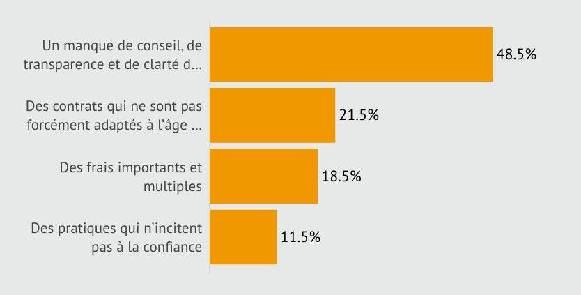 - Manque de conseil, de transparence et de clarté des contrats : 48,5 % des individus estiment que l'information insuffisante ou confuse les empêche de s'engager sereinement.