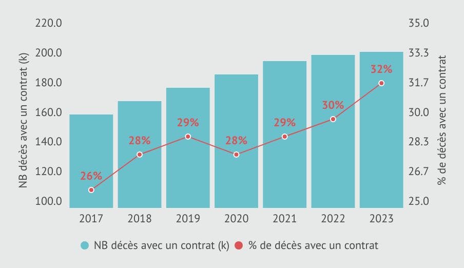 L’analyse des statistiques concernant le nombre de défunts ayant souscrit un contrat obsèques révèle une tendance à la hausse. En 2017, le nombre s'élevait à 163 000 personnes, représentant 26,9 % de la population concernée. Ce chiffre est passé à 172 000 (28,2 %) en 2018, à 181 000 (29,5 %) en 2019, puis à 190 000 (28,4 %) en 2020. En 2021, le nombre de défunts avec un contrat obsèques était de 199 000, soit 29,9 %, et a continué d'augmenter en 2022 avec 203 000 (30,9 %), pour finalement atteindre 205 000 (32,1 %) en 2023. Ces chiffres montrent non seulement une augmentation du nombre de défunts ayant un contrat obsèques, mais également une sensibilisation croissante à l'importance de cette forme de prévoyance.