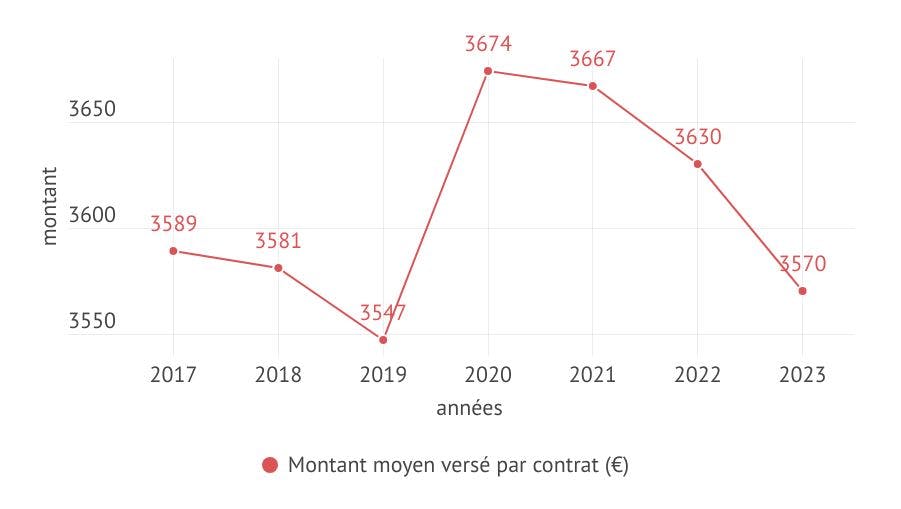 En 2023, le montant moyen versé par contrat s'est établi à 3 570 €. De 2019 à 2023, le montant a montré des variations intéressantes : en 2019, il était de 3 547 €, suivi d'une augmentation à 3 674 € en 2020. L'année 2021 a vu une légère baisse à 3 667 €, et en 2022, le montant moyen était de 3 630 €.