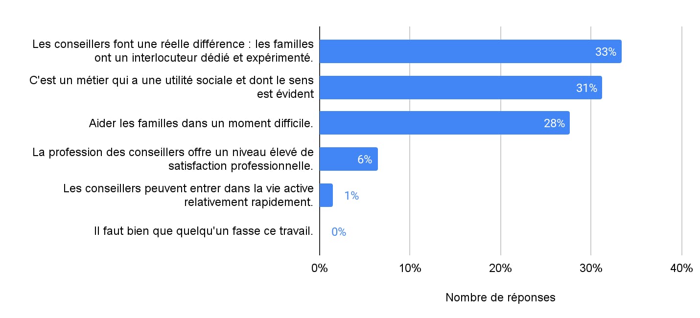 On observe que trois réponses se distinguent, avec une majorité orientée vers les familles. Les trois réponses majoritaires se ressemblent, mais elles ont des subtilités. On observe que le sens du métier est avant tout dans l’essence du rôle du conseiller funéraire, qui aide la famille dans l’organisation des obsèques, puis dans une logique sociale et dans l'aide apportée aux familles dans un moment difficile. Des subtilités et des nuances à creuser...