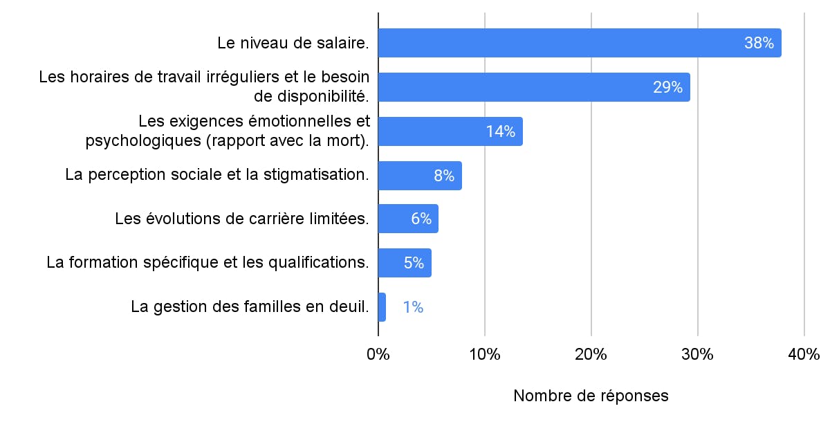 Le funéraire ne paie visiblement pas assez ! C'est le principal frein au recrutement avec, dans une moindre mesure, les complexités de gestion de planning. Ces deux réponses sont loin devant les autres sujets qui sont pourtant importants, comme la charge émotionnelle.