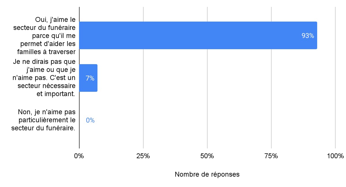 Il n'y a pas de débat : une écrasante majorité des sondés répondent aimer travailler dans le funéraire. Pour moi, c'est une super nouvelle, car personne n’est insensible à notre secteur. C’est un domaine d'activité atypique, qui peut effrayer ou repousser ceux qui ne le connaissent pas, mais on voit clairement dans ces réponses qu'il est apprécié par ses collaborateurs.