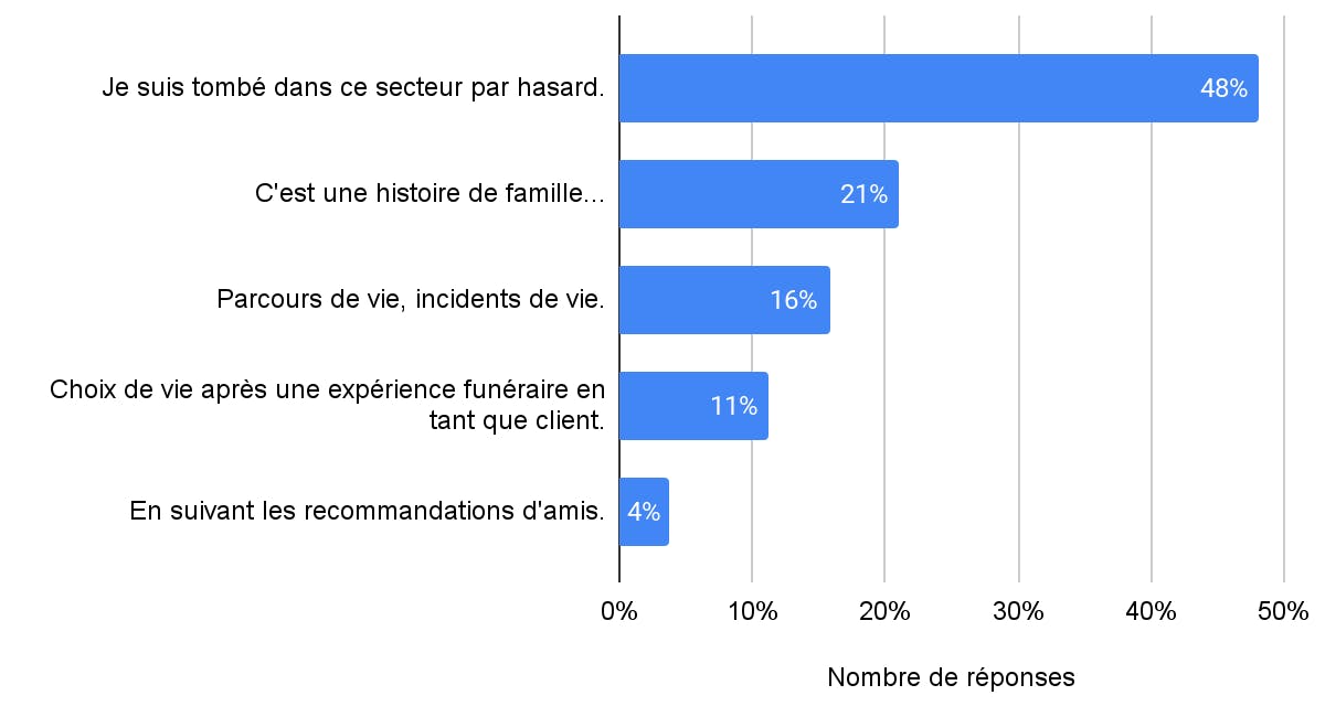 J’étais impatient de connaître la réponse à cette question qui m’a toujours taraudé. La réponse est sans appel : on entre dans le secteur du funéraire par hasard, dans 1 cas sur 2 ! Sinon, il y a différentes raisons, notamment les histoires de famille ou des parcours de vie.
