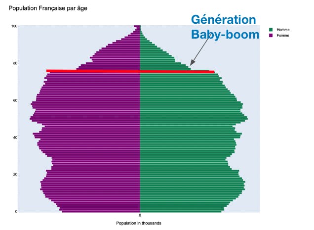 Ce graphique montre bien l’ampleur de cette évolution de population sur la génération du baby-boom. Il faut savoir que le baby-boom a commencé, dans une moindre mesure, dès 1941 et 1942. On constate aussi une forte augmentation du nombre de personnes âgées de plus de 90 ans.